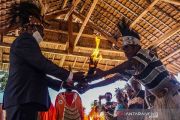 Ondoafi (kepala adat) Yafet Yansep (kanan) menyerahkan bara api ke tokoh adat Alberth Wambukomo (kiri) di Kampung Kaitemung, Distrik Nimboran-Genyem, Kabupaten Jayapura, Papua, Selasa (2/11/2021). Obor Peparnas Papua akan diarak hingga ke Stadion Mandala yang menjadi lokasi pembukaan Peparnas pada 5 November 2021. ANTARA FOTO/Indrayadi TH/rwa.