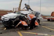 Petugas mengevakuasi mobil Pajero no polisi B 1264 BJU yang ditumpangi artis Vanessa Angel dan keluarganya usai mengalami kecelakaan di ruas tol Jombang-Mojokerto KM 672 arah Surabaya di Bandarkedungmulyo, Kabupaten Jombang, Jawa Timur, Kamis (4/11/2021). Kecelakaan tersebut menewaskan Vanessa Angel dan suaminya Febri Ardiansyah, sementara tiga orang penumpang lainnya mengalami luka-luka. ANTARA FOTO/Syaiful Arif/wsj.