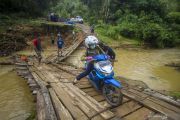 Pengendara motor tergelincir saat melintasi jembatan darurat di Desa Murung B, Kecamatan Hantakan, Kalimantan Selatan, Senin (8/11/2021). Jembatan darurat berbahan kayu dan bambu tersebut menjadi jembatan sementara untuk aktivitas warga Desa Murung B dan Desa Patikalain karena jembatan utama ambruk terbawa arus luapan sungai yang tinggi akibat hujan deras beberapa hari. ANTARA FOTO/Bayu Pratama S/aww.