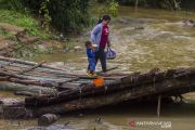 Warga melintasi jembatan darurat di Desa Murung B, Kecamatan Hantakan, Kalimantan Selatan, Senin (8/11/2021). Jembatan darurat berbahan kayu dan bambu tersebut menjadi jembatan sementara untuk aktivitas warga Desa Murung B dan Desa Patikalain karena jembatan utama ambruk terbawa arus luapan sungai yang tinggi akibat hujan deras beberapa hari. ANTARA FOTO/Bayu Pratama S/aww.
