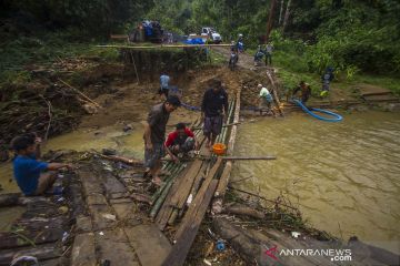 Sejumlah warga bergotong royong membangun jembatan darurat di Desa Murung B, Kecamatan Hantakan, Kalimantan Selatan, Senin (8/11/2021). Jembatan darurat berbahan kayu dan bambu tersebut menjadi jembatan sementara untuk aktivitas warga Desa Murung B dan Desa Patikalain karena jembatan utama ambruk terbawa arus luapan sungai yang tinggi akibat hujan deras beberapa hari. ANTARA FOTO/Bayu Pratama S/aww.