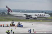 Pesawat kargo Boeing 777 Freighter Qatar Airways yang membawa logistik World Superbike (WSBK) mendarat di Bandara Internasional Lombok, Praya, Lombok Tengah, NTB, Selasa (9/11/2021). Pesawat berbadan lebar dengan nomor penerbangan QR8872 tersebut membawa semua logistik berupa mesin, sparepart motor dan perangkat lainnya yang akan dipakai pada ajang balap WSBK di Sirkuit Mandalika 19-21 November 2021 mendatang.ANTARA FOTO/Ahmad Subaidi/aww.