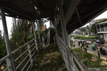 Petugas PPSU dan Sudin Pertamanan Jakarta Timur memotong pohon tumbang yang menimpa JPO Gelanggang Olahraga di Jalan Otista Raya, Jakarta, Selasa (9/11/2021). Dua pohon beringin yang tumbang akibat dimakan usia itu menyebabkan belasan kendaraan dan JPO rusak tertimpa serta dua orang mengalami luka-luka. ANTARA FOTO/Indrianto Eko Suwarso/aww.