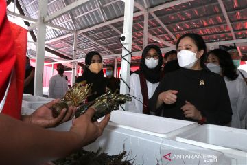 Ketua DPR Puan Maharani (kanan) didampingi Bupati Banyuwangi Ipuk Fiestiandani (kedua kiri) berdialog dengan pedagang lobster di Kampung Mandar, Banyuwangi, Jawa Timur, Jumat (12/11/2021). Pada kunjungan kerja di Banyuwangi Ketua DPR berdialog dengan nelayan membahas permasalahan dan kemajuan yang dirasakan pada sektor perikanan. ANTARA FOTO/Budi Candra Setya/pras.