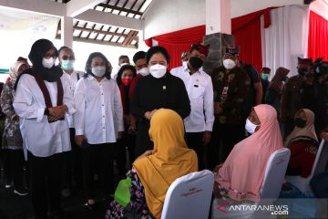 Ketua DPR Puan Maharani (ketiga kanan) didampingi Menteri Pemberdayaan Perempuan dan Perlindungan Anak I Gusti Ayu Bintang Darmawati (kedua kiri), Menteri Kelautan dan Perikanan Sakti Wahyu Trenggono (kedua kanan) dan Bupati Banyuwangi Ipuk Fiestiandani (kiri) berdialog dengan warga di Kampung Mandar Banyuwangi, Jawa Timur, Jumat (12/11/2021). Pada kunjungan kerja di Banyuwangi Ketua DPR berdialog dengan nelayan membahas permasalahan dan kemajuan yang dirasakan pada sektor perikanan. ANTARA FOTO/Budi Candra Setya/pras.