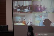 Terdakwa Gubernur nonaktif Sulawesi Selatan Nurdin Abdullah (kedua kiri, bawah) menjalani persidangan secara virtual dengan agenda pembacaan tuntutan di Gedung Merah Putih KPK, Jakarta, Senin (15/11/2021). Nurdin Abdullah dituntut 6 tahun penjara ditambah denda Rp500 juta subsider 6 bulan kurungan karena dinilai terbukti menerima suap sebesar Rp13,812 miliar terkait dugaan suap dan gratifikasi. ANTARA FOTO/Reno Esnir/aww.