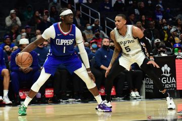 Pebasket Los Angeles Clippers Reggie Jackson (kiri) mengontrol bola dari penjagaan pebasket San Antonio Spurs Dejounte Murray (kanan) dalam laga lanjutan NBA, di Staples Cente, Los Angeles, California, Amerika Serikat, Selasa (16/11). Los Angeles Clippers berhasil mengalahkan San Antonio Spurs 106 -92. ANTARA FOTO/Reuters-Gary A. Vasquez-USA TODAY Sports/hp.