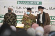 Ketua Umum Pengurus Besar Nahdlatul Ulama (PBNU) KH Said Aqil Siradj (kiri) didampingi Pengasuh pondok pesantren Lirboyo KH Abdullah Kafabihi Mahrus (kanan) melakukan orasi ilmiah di Pondok Pesantren Lirboyo, Kota Kediri, Jawa Timur, Kamis (18/11/2021). Ketua Umum PBNU melakukan safari ke sejumlah pondok pesantren besar di Jawa Timur menjelang Muktamar Nahdlatul Ulama ke-34 pada Desember 2021 mendatang. ANTARA FOTO/Prasetia Fauzani/hp.