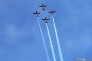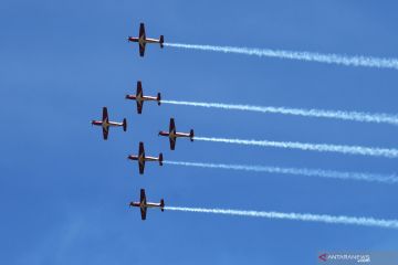 Pesawat Jupiter Aerobatic Team TNI AU beraksi saat sesi latihan jelang pembukaan balapan World Superbike (WSBK) di kawasan sirkuit Pertamina Mandalika International Street Circuit, Lombok Tengah, Nusa Tenggara Barat (NTB), Kamis (18/11/2021). Balapan WSBK Mandalika yang menjadi seri pamungkas World Superbike musim 2021 itu dijadwalkan berlangsung pada Jumat (19/11/2021) hingga Minggu (21/11/2021). ANTARA FOTO/Andika Wahyu/hp.