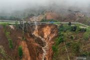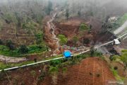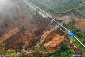 Foto udara di sekitar lokasi tanah longsor yang memutus jalan utama di Kawasan Wisata Darajat Pass, Kabupaten Garut, Jawa Barat, Sabtu (20/11/2021). Tanah longsor yang terjadi pada Jumat (19/11/2021) sore tersebut menyebabkan akses menuju Kawah Darajat terputus dan puluhan hektare lahan pertanian rusak. ANTARA FOTO/Raisan Al Farisi/wsj.