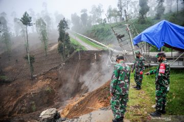 Sejumlah aparat TNI berjaga di sekitar lokasi tanah longsor yang memutus jalan utama di Kawasan Wisata Darajat Pass, Kabupaten Garut, Jawa Barat, Sabtu (20/11/2021). Tanah longsor yang terjadi pada Jumat (19/11/2021) sore tersebut menyebabkan akses menuju Kawah Darajat terputus dan puluhan hektare lahan pertanian rusak. ANTARA FOTO/Raisan Al Farisi/wsj.