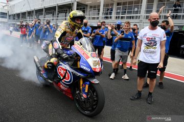 Pembalap tim Pata Yamaha With Brixx WorldSBK Toprak Razgatlioglu berfoto dengan papan tanda juara dunia 2021 seusai balapan pertama (race 1) WSBK seri Indonesia 2021di Pertamina Mandalika International Street Circuit, Lombok Tengah, Nusa Tenggara Barat (NTB), Minggu (21/11/2021). Toprak Razgatlioglu berhasil menjadi juara dunia WSBK 2021. ANTARA FOTO/Andika Wahyu/hp.