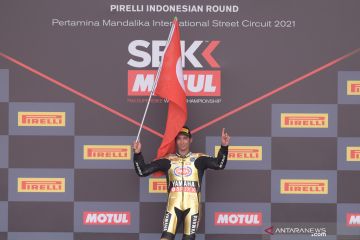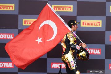 Pembalap tim Pata Yamaha With Brixx WorldSBK Toprak Razgatlioglu mengibarkan bendera Turki seusai balapan pertama (race 1) WSBK seri Indonesia 2021di Pertamina Mandalika International Street Circuit, Lombok Tengah, Nusa Tenggara Barat (NTB), Minggu (21/11/2021). Toprak Razgatlioglu berhasil menjadi juara dunia WSBK 2021. ANTARA FOTO/Andika Wahyu/hp.