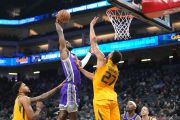 Pebasket Utah Jazz Hassan Whiteside (kiri) melakukan selebrasi setelah berhasil mendapatkan poin dengan dunk saat melawan Sacramento Kings dalam laga lanjutan NBA, di Golden 1 Center, Sacramento, California, Amerika Serikat, Sabtu (20/11/2021). Utah Jazz berhasil mengalahkan Sacramento Kings 96 - 82. ANTARA FOTO/Reuters-Darren Yamashita-USA TODAY Sports/hp.