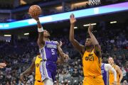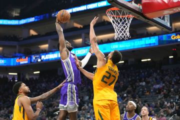 Pebasket Sacramento Kings De'Aaron Fox (kiri) berupaya memasukkan bola ke jaring lawan yang dijaga pebasket Utah Jazz Hassan Whiteside (kanan) dalam laga lanjutan NBA, di Golden 1 Center, Sacramento, California, Amerika Serikat, Sabtu (20/11/2021). Utah Jazz berhasil mengalahkan Sacramento Kings 96 - 82. ANTARA FOTO/Reuters-Darren Yamashita-USA TODAY Sports/hp.