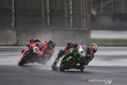 Sejumlah pembalap memutari lintasan sebelum start race 2 WorldSBK seri Indonesia 2021 di Pertamina Mandalika International Street Circuit, Lombok Tengah, Nusa Tenggara Barat (NTB), Minggu (21/11/2021). Dalam race 2 tersebut pembalap tim Kawasaki Racing WorldSBK Jonathan Rea keluar sebagai juara pertama diikuti pembalap tim Aruba.it Racing - Ducati Scott Redding kemudian pembalap tim BMW MOTORRAD Michael Van Der Mark. ANTARA FOTO/Sigid Kurniawan/pras.