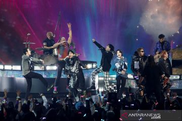 Grup musik BTS dan Coldplay beraksi dalam gelaran 49th Annual American Music Awards di Microsoft Theatre, Los Angeles, California, AS, Minggu (21/11/2021). BTS mencatatkan sejarah sebagai artis Asia pertama yang memenangkan penghargaan tersebut. ANTARA FOTO/REUTERS/Mario Anzuoni/foc.