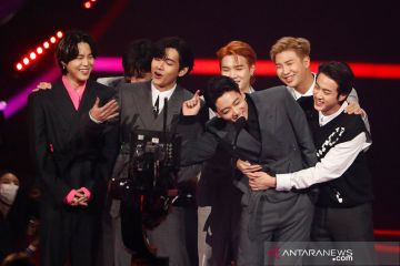 Grup musik Korsel BTS menerima penghargaan Artist of the Year dalam gelaran 49th Annual American Music Awards di Microsoft Theatre, Los Angeles, California, AS, Minggu (21/11/2021). BTS mencatatkan sejarah sebagai artis Asia pertama yang memenangkan penghargaan tersebut. ANTARA FOTO/REUTERS/Mario Anzuoni/foc.