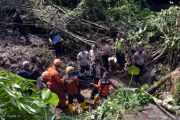 Petugas gabungan mencari wisatawan yang menjadi korban saat terjadi bencana longsor di Banjar Begawan, Desa Melinggih Kelod, Payangan, Gianyar, Bali, Jumat (26/11/2021). Bencana longsor yang terjadi pada Kamis (25/11/2021) sekitar pukul 14.00 WITA di kawasan wisata arung jeram yang menimpa rombongan wisatawan tersebut menewaskan tiga orang dan tiga orang lainnya mengalami luka-luka akibat tertimbun material tanah longsor. ANTARA FOTO/Nyoman Hendra Wibowo/wsj.