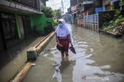 Seorang pelajar berjalan melintasi banjir yang menggenangi permukiman di Kampung Bojongasih, Dayeuhkolot, Kabupaten Bandung, Jawa Barat, Jumat (26/11/2021). Hujan dengan intensitas tinggi pada Kamis (25/11/2021) membuat ratusan rumah di Kecamatan Baleendah dan Dayeuhkolot terendam banjir luapan Sungai Citarum setinggi 50 sentimeter hingga satu meter. ANTARA FOTO/Raisan Al Farisi/aww.