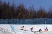 Atlet ski Swiss Tobias Baur bersama atlet Italia Dominik Zuech dan atlet ski Perancis Romain Mari beraksi pada nomor lintas ski putra pada uji coba Olimpiade Musin Dingin Beijing 2022 di Genting Snow Park, Zhangjiakou, China, Sabtu (27/11/2021). ANTARA FOTO/REUTERS/Tingshu Wang/rwa.