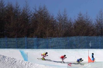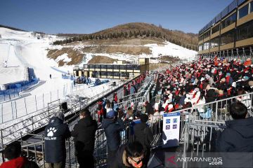 Penonton menyaksikan kompetisi lintas ski putra pada uji coba Olimpiade Musin Dingin Beijing 2022 di FIS Ski Cross World Cup - Genting Snow Park, Zhangjiakou, China, Sabtu (27/11/2021). ANTARA FOTO/REUTERS/Tingshu Wang/rwa.