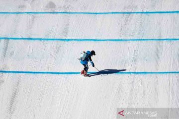 Seorang anggota staf melukis garis di lereng sebelum kompetisi lintas ski putra pada uji coba Olimpiade Musin Dingin Beijing 2022 di FIS Ski Cross World Cup - Genting Snow Park, Zhangjiakou, China, Sabtu (27/11/2021). ANTARA FOTO/REUTERS/Tingshu Wang/rwa.