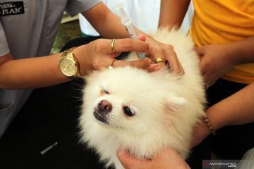 Seorang petugas kesehatan hewan menyuntikkan vaksin pada anjing peliharaan warga saat vaksinasi rabies di Summarecon Bogor, Kabupaten Bogor, Jawa Barat , Minggu (28/11/2021). Menteri Pertanian Syahrul Yasin Limpo mencanangkan Indonesia bebas rabies pada tahun 2030 sehingga sejalan dengan target global yang diprakarsai oleh Badan Kesehatan Dunia (WHO), Organisasi Kesehatan Hewan Dunia (OIE), Badan Pangan dan Pertanian Perserikatan Bangsa-Bangsa (FAO) dan Global Alliance for Rabies Control (GARC). ANTARA FOTO/Yulius Satria Wijaya/wsj.