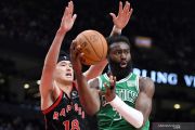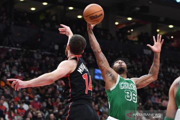 Pebasket Boston Celtics Jayle Brown (kanan) mendribel bola dan berupaya melewati penjagaan pebasket Toronto Raptors Pascal Siakam (kiri) dalam laga lanjuta NBA, di Scotiabank Arena, Toronto, Ontario, Kanada, Minggu (28/11/2021). Boston Celtics berhasil mengalahkan Toronto Raptors 109 -97ANTARA FOTO/Reuters-Dan Hamilton-USA TODAY Sports/hp.