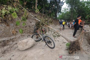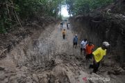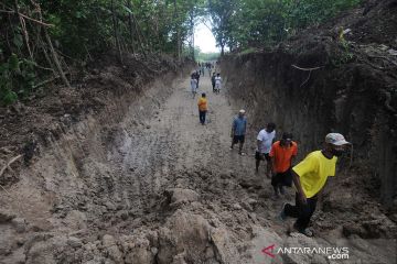 Warga memblokir akses menuju lahan milik mereka yang dikeruk tanahnya di Kaligawe, Pedan, Klaten, Jawa Tengah, Sabtu (4/12/2021). Warga setempat protes dengan cara memblokir lokasi lahan dan menghentikan proses pengerukan tanah pada lahan milik warga yang akan digunakan sebagai tanah uruk pembangunan jalan tol Solo-Yogyakarta karena belum adanya pemberitahuan kepada warga. ANTARA FOTO/Aloysius Jarot Nugroho/aww.