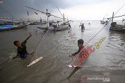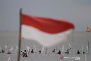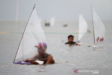Peserta bersiap di garis start saat mengikuti lomba balap perahu layar mini di Pantai Kenjeran, Bulak Cumpat, Surabaya, Jawa Timur, Sabtu (4/12/2021). Kegiatan yang diikuti 102 peserta tersebut guna menarik wisatawan sekaligus penyaluran hobi balap perahu layar mini bagi masyarakat nelayan di sekitar Pantai Kenjeran. ANTARA FOTO/Moch Asim/rwa.