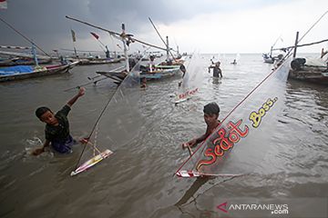 Peserta mempersiapkan perahu saat mengikuti lomba balap perahu layar mini di Pantai Kenjeran, Bulak Cumpat, Surabaya, Jawa Timur, Sabtu (4/12/2021). Kegiatan yang diikuti 102 peserta tersebut guna menarik wisatawan sekaligus penyaluran hobi balap perahu layar mini bagi masyarakat nelayan di sekitar Pantai Kenjeran. ANTARA FOTO/Moch Asim/rwa.