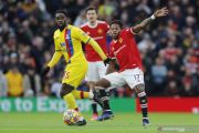Pesepak bola Crystal Palace Jeffrey Schlupp (kiri) berebut bola dengan pesepak bola Manchester United Fred (kanan) dalam laga lanjutan Liga Inggris, di Stadion Old Trafford, Manchester, Inggris, Minggu (5/12/2021). ANTARA FOTO/Reuters-Phil Noble/hp.