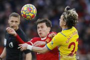 Pesepak bola Manchester United Victor Lindelof (kedua kanan) berebut bola dengan pesepak bola Crystal Palace Conor Gallagher (kanan) dalam laga lanjutan Liga Inggris, di Stadion Old Trafford, Manchester, Inggris, Minggu (5/12/2021). ANTARA FOTO/Reuters-Phil Noble/hp.