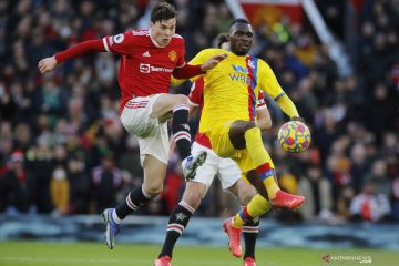 Pesepak bola Manchester United Victor Lindelof i(kiri) berebut bola dengan pesepak bola Crystal Palace Christian Benteke (kanan) dalam laga lanjutan Liga Inggris, di Stadion Old Trafford, Manchester, Inggris, Minggu (5/12/2021). ANTARA FOTO/Reuters-Phil Noble/hp.