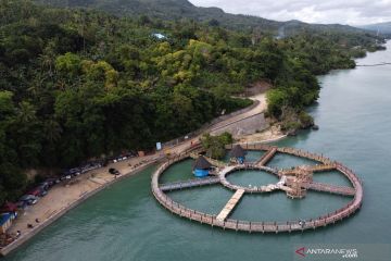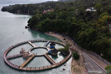 Foto udara wisata Jembatan Lingkar Lapoili di Desa Wangi-wangi, Kecamatan Sampolawa, Buton Selatan, Sulawesi Tenggara, Senin (6/12/2021). Wisata Jembatan Lingkar Lapoili berhasil meraih juara 3 pada Anugerah Pesona Indonesia (API) Award 2021 kategori Destinasi Wisata Keatif yang pengembangannya memanfaatkan Dana Desa. ANTARA FOTO/Jojon/hp.