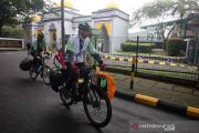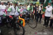 Dua warga, Tjahja Gunawan (kanan) dan Muhammad Fuad (kiri) mengayuh sepedanya menuju ke Kota Mekkah untuk menunaikan ibadah haji usai dilepas keberangkatannya oleh Wali Kota Tangerang Selatan Benyamin Davnie di Serpong, Tangerang Selatan, Banten, Sabtu (11/12/2021). Mereka akan menempuh jarak sekitar 12.500 km jalur darat dan 750 km jalur laut selama enam bulan dan tiba bertepatan dengan musim haji 2021 atau pada 1443 Hijriah. ANTARA FOTO/Muhammad Iqbal/wsj.