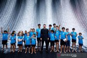 Pesepak bola Lionel Messi berdiri untuk foto bersama dengan anak-anak di Surreal, Water Feature di Dubai Expo 2020, Uni Emirat Arab (13/12/2021). ANTARA FOTO/Expo 2020/Handout via REUTERS/aww.
