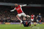 Pesepak bola West Ham United Vladimir Coufal (bawah) menjatuhkan pesepak bola Arsenal Alexandre Lacazette dan wasit memberikan penalti atas pelanggaran ini dalam laga lanjutan Liga Inggris, di Stadion Emirates Stadium, London, Inggris, Rabu (15/12/2021). Arsenal berhasil mengalahkan West Ham United 2-0. ANTARA FOTO/Reuters-Andrew Couldridge/hp.