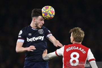 Pesepak bola West Ham United Declan Rice (kiri) berebut bola dengan pesepak bola Arsenal Martin Odegaard dalam laga lanjutan Liga Inggris, di Stadion Emirates Stadium, London, Inggris, Rabu (15/12/2021). Arsenal berhasil mengalahkan West Ham United 2-0. ANTARA FOTO/Reuters-Tony Obrien/hp.