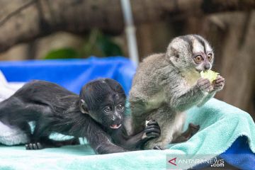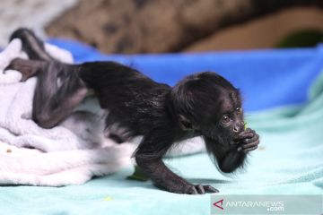 Congcong, seekor anak monyet saki berjanggut hitam, terlihat bermain-main di Taman Safari Chimelong di Guangzhou, ibu kota Provinsi Guangdong, China selatan, Kamis (16/12/2021). Congcong, anak monyet saki berjanggut hitam berjenis kelamin jantan yang lahir pada 22 Juli 2021 di Taman Safari Chimelong di Guangzhou, tampil perdana di depan publik di taman safari tersebut pada Kamis (16/12). ANTARA FOTO/Xinhua/Huang Guobao/pras.