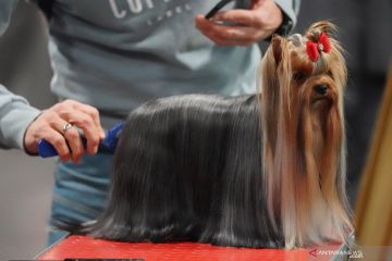 Peserta menyisir bulu seekor anjing dalam PetExpo 2021 di Riga, Latvia, Minggu (19/12/2021). PetExpo 2021 merupakan pameran industri hewan peliharaan internasional yang digelar di Riga dari 18 hingga 19 Desember. ANTARA FOTO/Xinhua/Janis Laizans/foc.