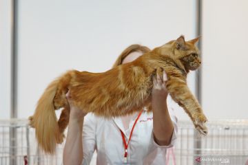 Seekor kucing digendong peserta dalam PetExpo 2021 di Riga, Latvia, Minggu (19/12/2021). PetExpo 2021 merupakan pameran industri hewan peliharaan internasional yang digelar di Riga dari 18 hingga 19 Desember. ANTARA FOTO/Xinhua/Janis Laizans/foc.