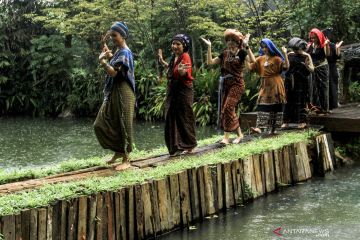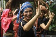 Pegiat menari dengan berbusana wastra nusantara di Depok, Jawa Barat, Rabu (22/12/2021). Peragaan wastra (Sansekerta: sehelai kain) nusantara dengan tema Sapawastra tersebut untuk memperingati Hari Ibu yang bertujuan untuk melestarikan dan memperkenalkan kain tradisional yang sarat akan makna budaya. ANTARA FOTO/Asprilla Dwi Adha/foc.