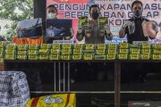 Tersangka dan barang bukti dihadirkan dalam rilis kasus narkoba di kantor Bareskrim Polri, Jakarta, Kamis (23/12/2020). Direktorat Tindak Pidana Narkoba Bareskrim Polri berhasil mengungkap kasus peredaran narkoba jaringan luar negeri dengan total barang bukti 220 kilogram sabu, 200.000 butir pil ekstasi dan 47.500 butir pil happy five dengan mengamankan tiga tersangka. ANTARA FOTO/Galih Pradipta/aww.