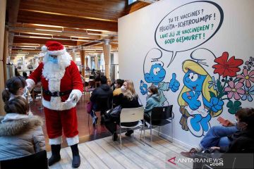 Seorang pria berpakaian Sinterklas menyambut orang-orang yang mengikuti vaksinasi COVID-19 sebelum perayaan Natal di Brussels, Belgia, Jumat (24/12/2021). ANTARA FOTO/REUTERS/Johanna Geron/rwa.