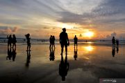 Wisatawan menikmati pemandangan matahari terbenam (sunset) di kawasan wisata Pantai Double Six di Seminyak, Badung, Bali, Sabtu (25/12/2021). Sejumlah destinasi wisata di Pulau Dewata dipadati oleh wisatawan domestik dari berbagai daerah di Indonesia saat libur Hari Raya Natal 2021. ANTARA FOTO/Fikri Yusuf/wsj.