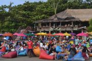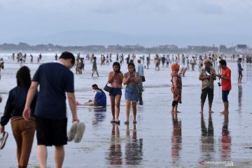 Wisatawan mengunjungi kawasan wisata Pantai Double Six di Seminyak, Badung, Bali, Sabtu (25/12/2021). Sejumlah destinasi wisata di Pulau Dewata dipadati oleh wisatawan domestik dari berbagai daerah di Indonesia saat libur Hari Raya Natal 2021. ANTARA FOTO/Fikri Yusuf/wsj.