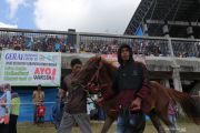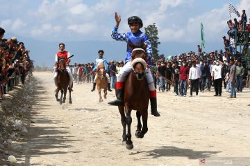 Seorang joki berselebrasi dari atas kuda lokal gayonya usai menang dalam lomba pacuan kuda tradisional di lapangan pacuan kuda Sengeda, Bener Meriah, Aceh, Sabtu (25/12/2021). Pacuan kuda tradisional tersebut digelar dalam rangka memeriahkan HUT ke-17 Kabupaten Bener Meriah. ANTARA FOTO/Irwansyah Putra/wsj.