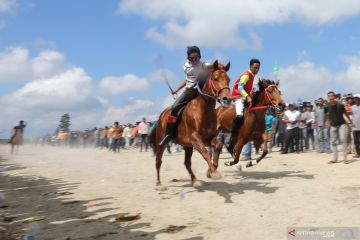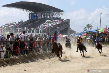 Sejumlah Joki memacu kuda lokal gayo pada lomba pacuan kuda tradisional di lapangan pacuan kuda Sengeda, Bener Meriah, Aceh, Sabtu (25/12/2021). Pacuan kuda tradisional tersebut digelar dalam rangka memeriahkan HUT ke-17 Kabupaten Bener Meriah. ANTARA FOTO/Irwansyah Putra/wsj.